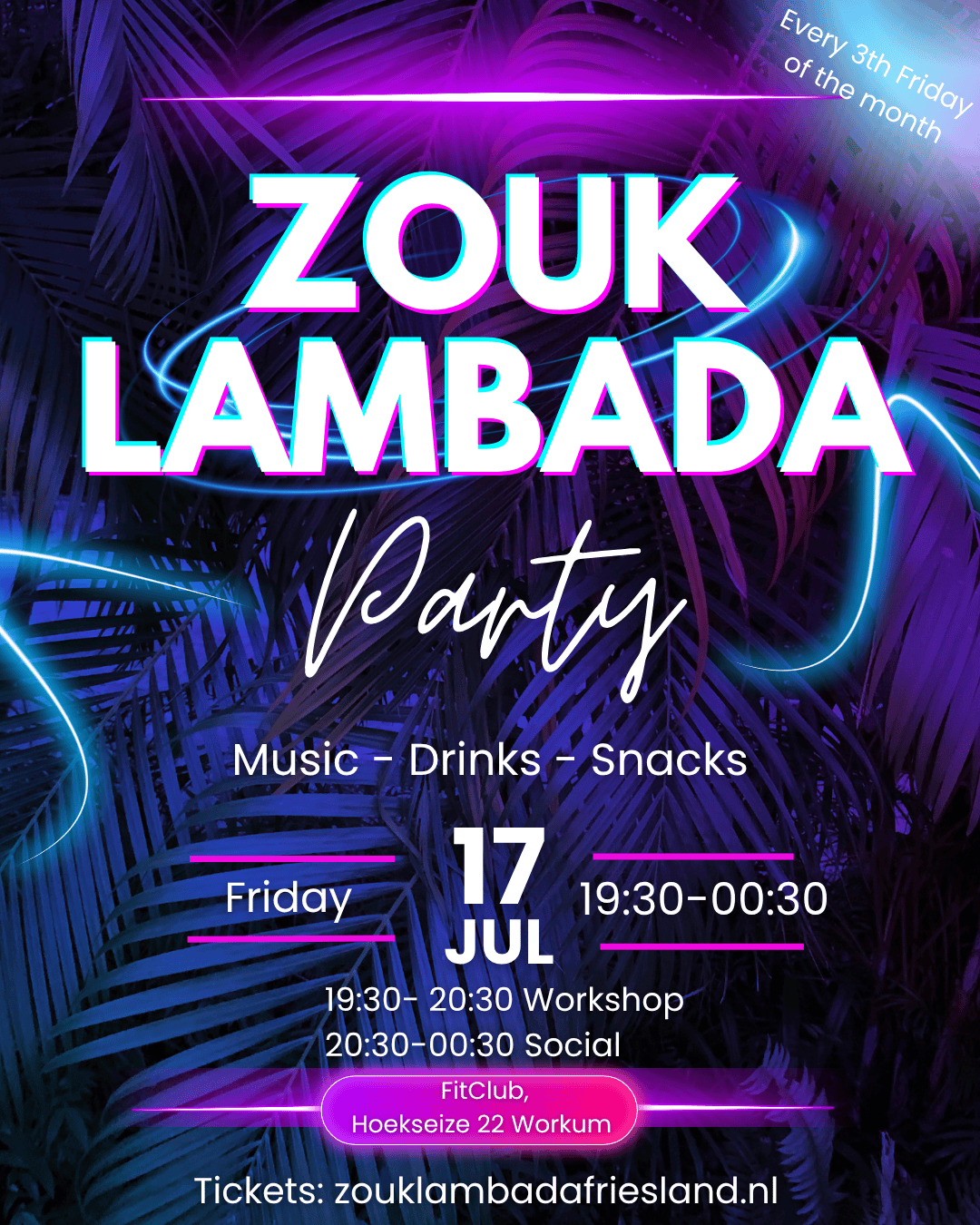 We start with a Zouk or Lambada workshop, followed by a social dance evening full of good vibes, music & connection. 💛